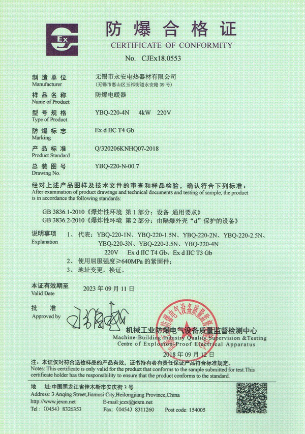 防爆证-箱体防爆电加热器